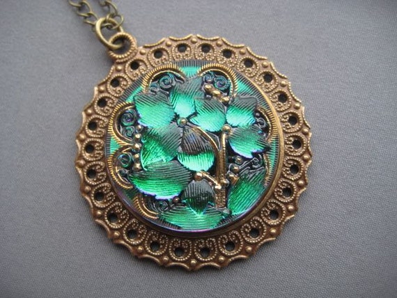 Emerald Necklace - Glass Flower Necklace - Glass Button Jewelry - Stained Glass Pendant - Emerald Jewelry - Glass Button Necklace - Antique Style Jewelry - Green Pendant - Vintage Style Jewelry